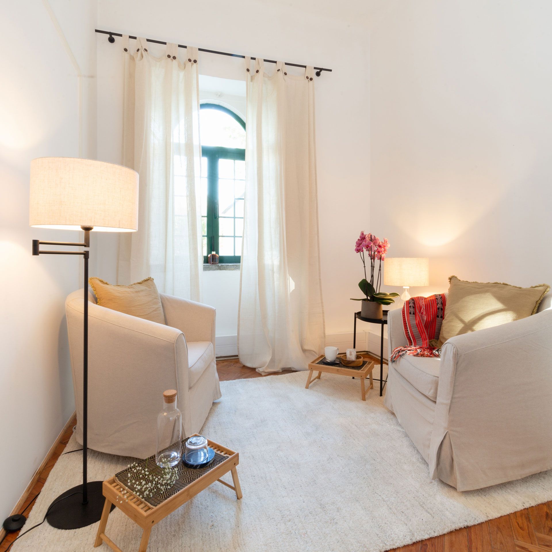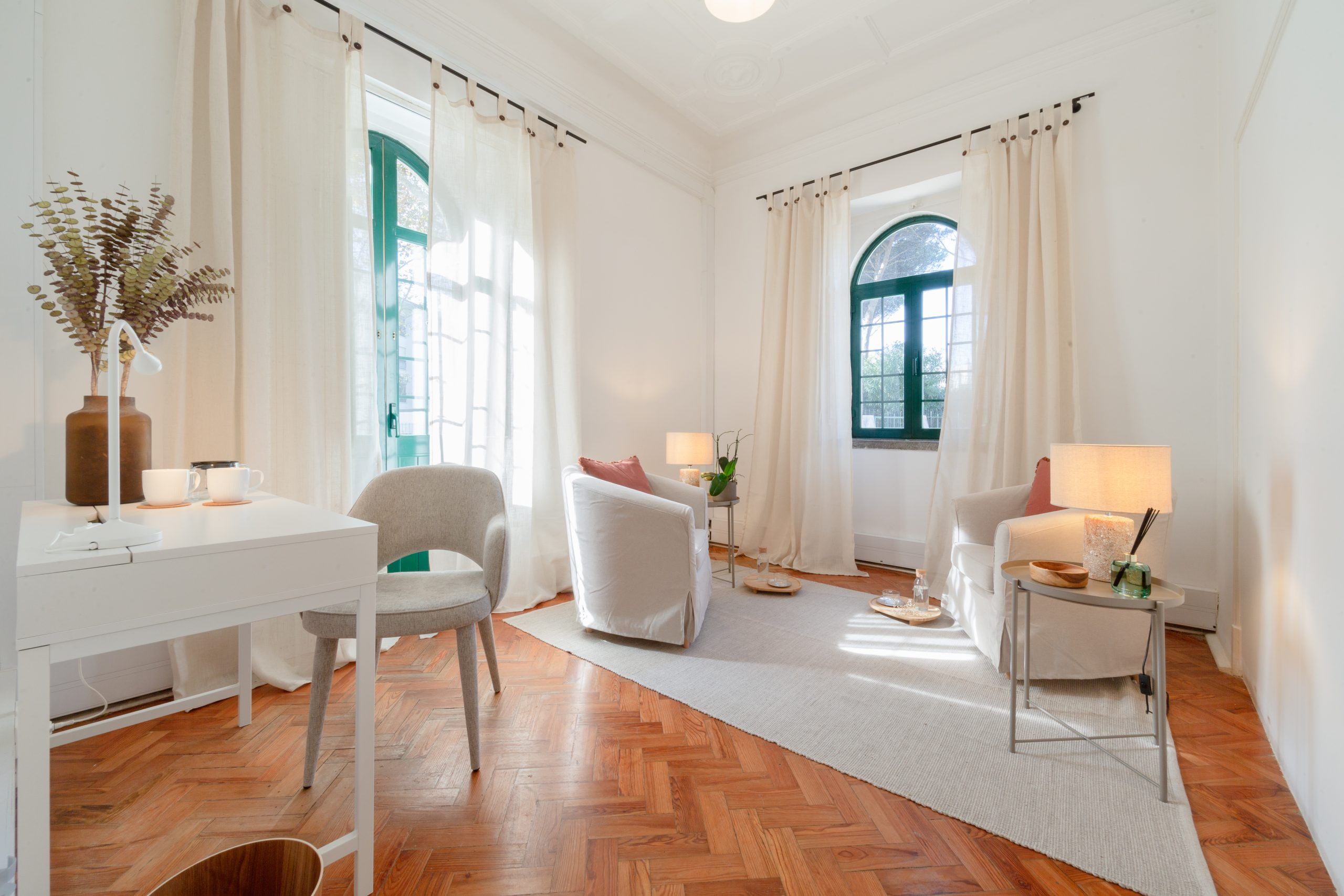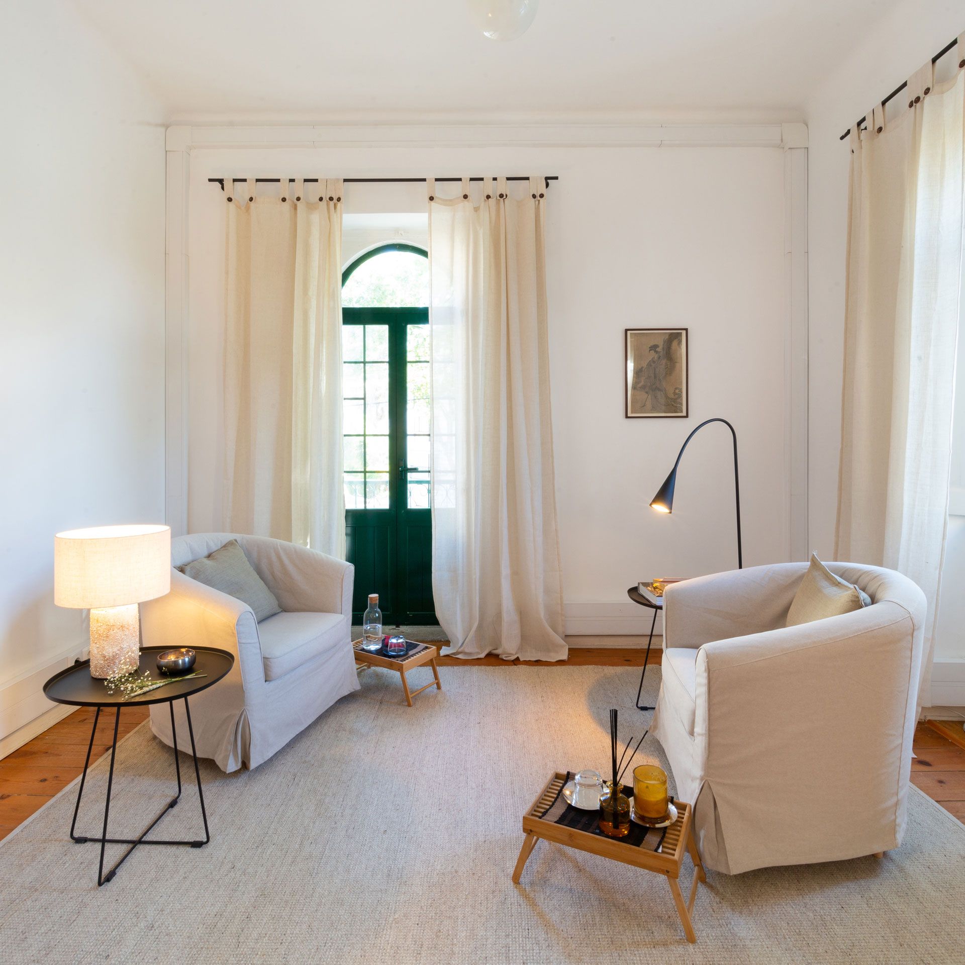 Todas as salas têm uma bonita luz natural e estão decoradas com uma atmosfera serena e confortável, definida por materiais naturais e um estilo minimalista.